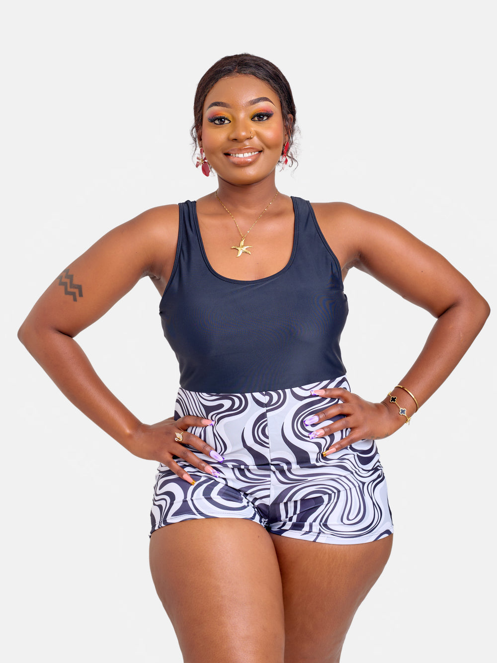 Fluid print one piece with shorts