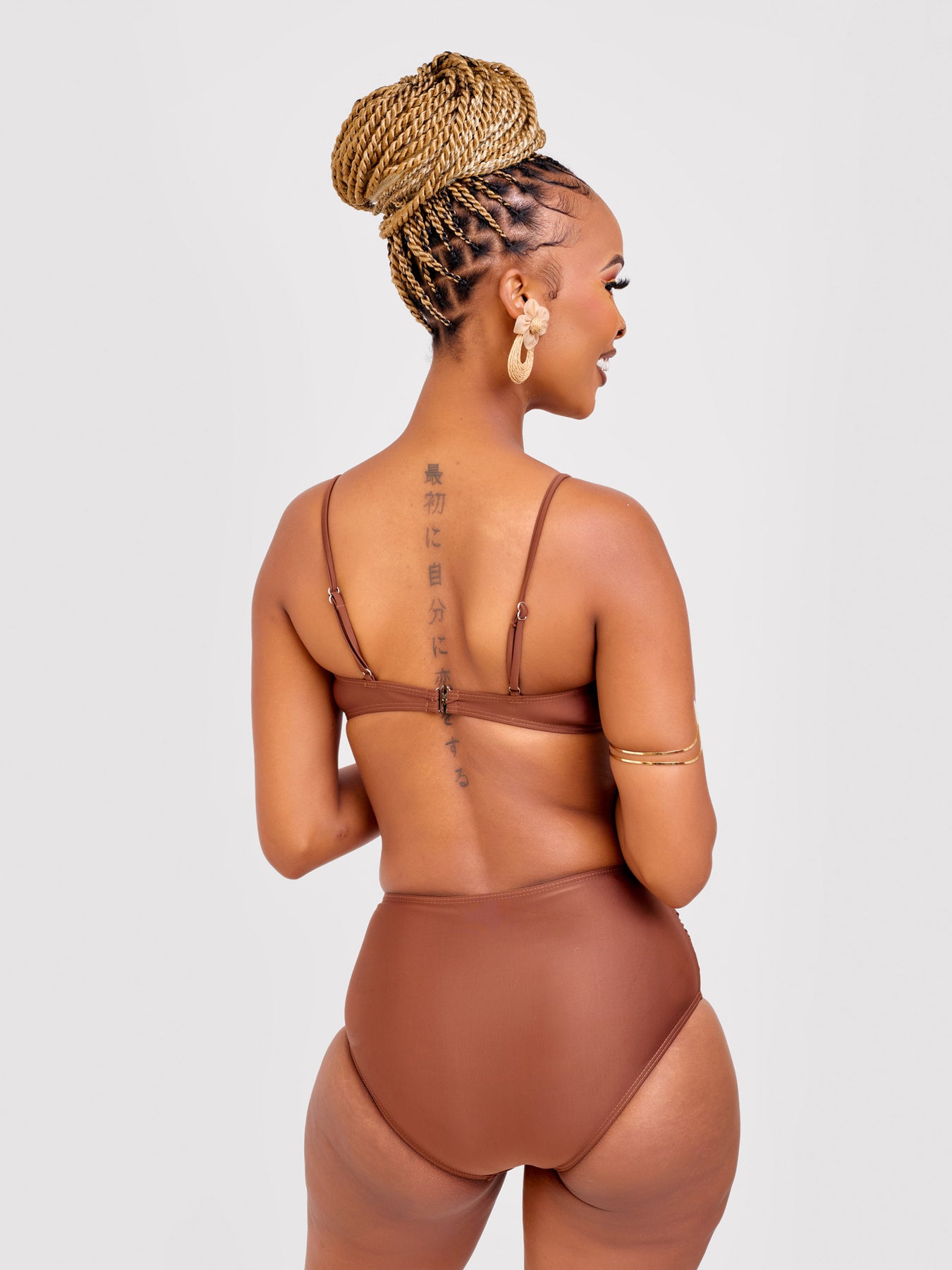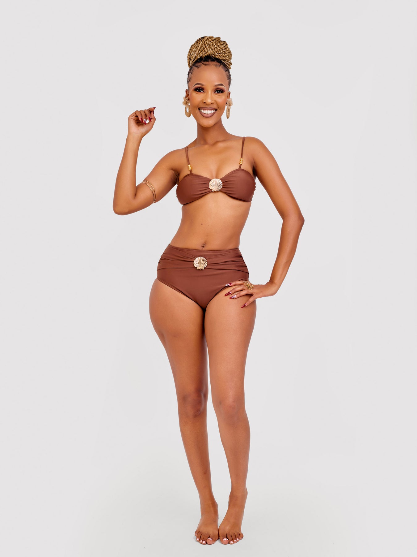 Elevate your beach style with our rich chocolate bikini featuring support and eye-catching gold shell.