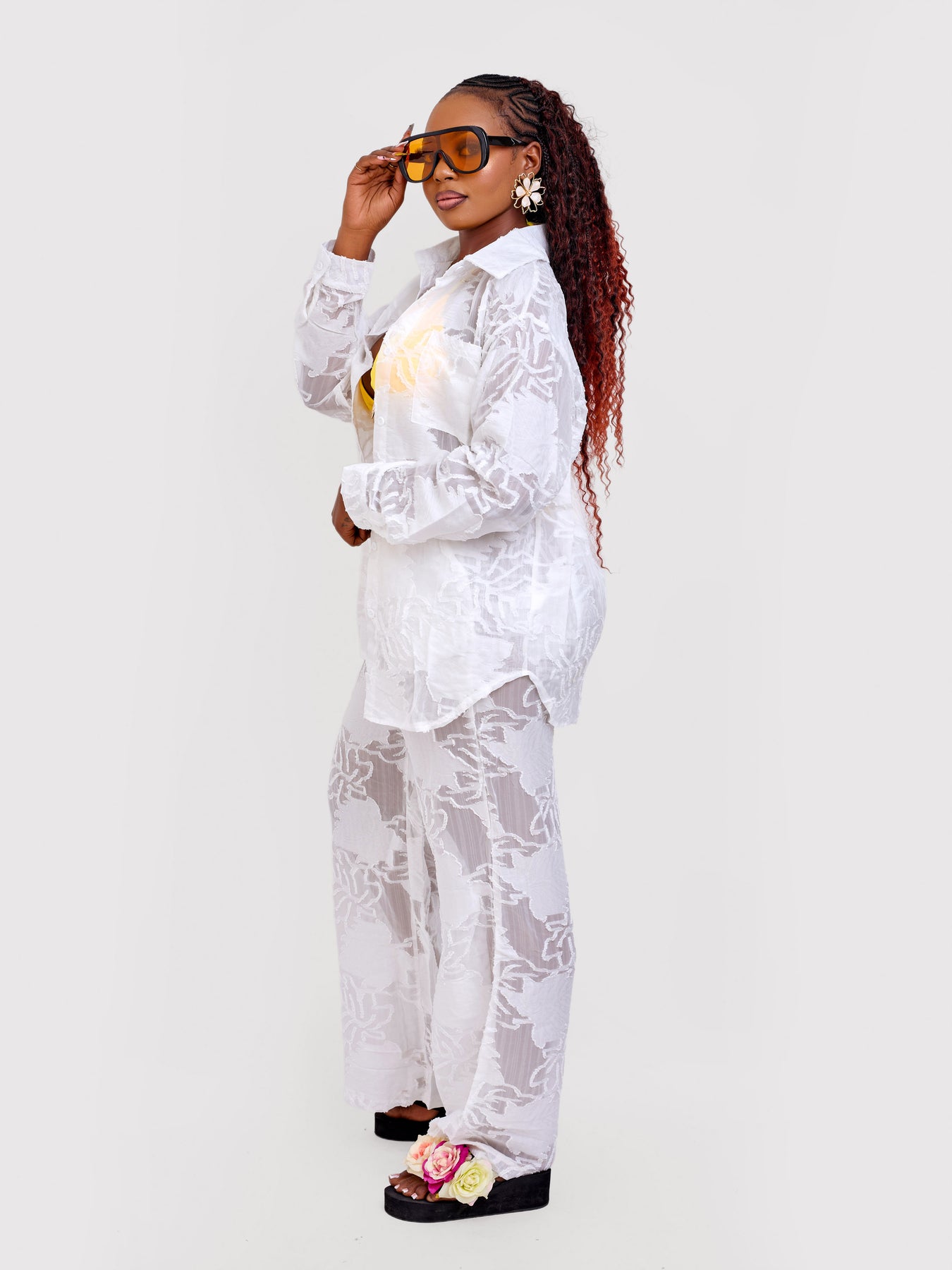 Lace vacation 2pc trouser set with breezy, elegant lace fabric and a flattering fit—perfect for resort wear, beach vacations, and stylish summer outfits.